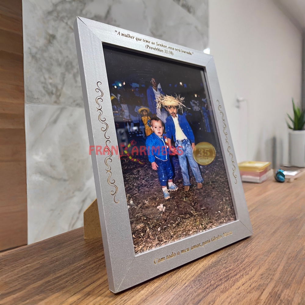 Para tornar a peça ainda mais inesquecível, realizamos a gravação a laser diretamente na moldura. Você pode escolher eternizar nomes, datas importantes ou aquela frase especial nas quatro partes da moldura (já inclusas no valor). Para garantir um acabamento impecável, a área máxima de gravação é de 10,5 cm por lado, respeitando uma discreta margem de segurança (sangria) de 2 mm entre as bordas, o que proporciona um visual limpo e super bem alinhado.